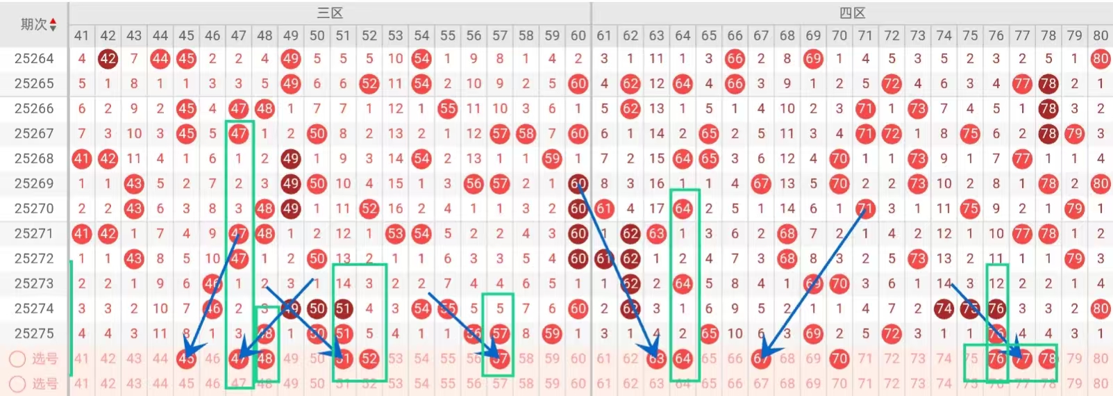 四区间上期开出65-69-72-76, 共4个号码,本期大家可以根据尾数、隔期码、以及边码走势情况,本期首先需看77相邻码、76会再出现;上期76-80区间未开出号,本期出号77机会比较大,本期四区有连续号76-77-78预测会出,上期龙头65,凤尾76,本期预测龙头63、凤尾78,本四区间建议大家关注号码67会出,再根据号码走势预防连续号76-77-78出现。综合分析筛选,本期四区推荐:63-64-67-76-77-78