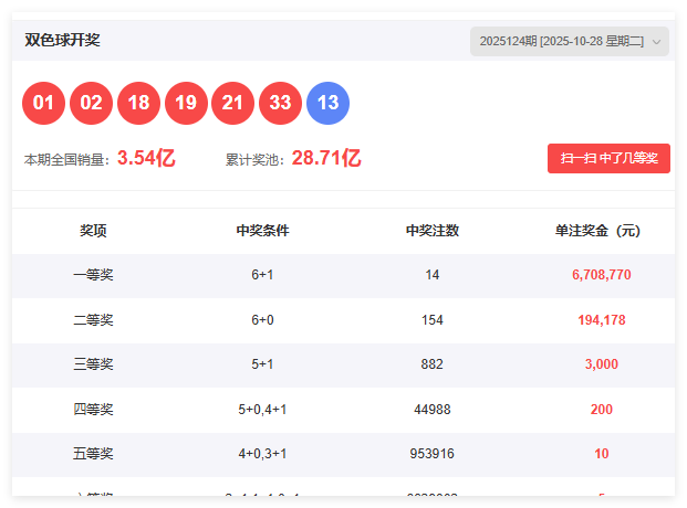 彩虹多多的朋友们大家好,我是算王乐乐双双。今天是双色球第125期开奖,那么首先我们回顾一下124期双色球一等奖啊,共开出了14注,单注奖金达到670万。二等奖开出154注,单注奖金达到19.4万。目前奖池累计达到了28.71亿