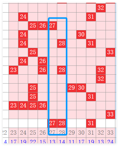 接下来我们看一下三分区,三分区上期开出了一枚号码33号,那本期的话,33是要往左进行一个运动。那么往左的号码进的话,我们需要关注31号,间隔两期。其次要关注点位27号28号这个地方的话,也是有号码可以出的。那么23242526这个地方呢,我们暂时就不用考虑了。所以说,三区的话,可能会开出啊,一个到两个号码,至少是有一个号码。