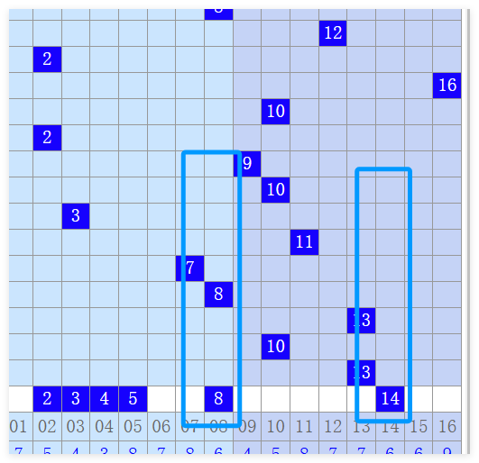 接下来我们看一下后面的蓝号。蓝号上期开了一个间隔一期13号,那么本期的话,我们还是要考虑大号14的边号。也有可能会停留在这里。其次,我们还要关注1~8这个区间的号码,那么蓝号很有可能会开出8号这样一个等腰梯形的一个结构。其次,还要关注一下大跨度2345可能会跑到这里。我们重点关注同路的4号,他都属于一路号码,那么这是后面蓝号的一个区域,这个定位重点呢,是关注着0408和14。