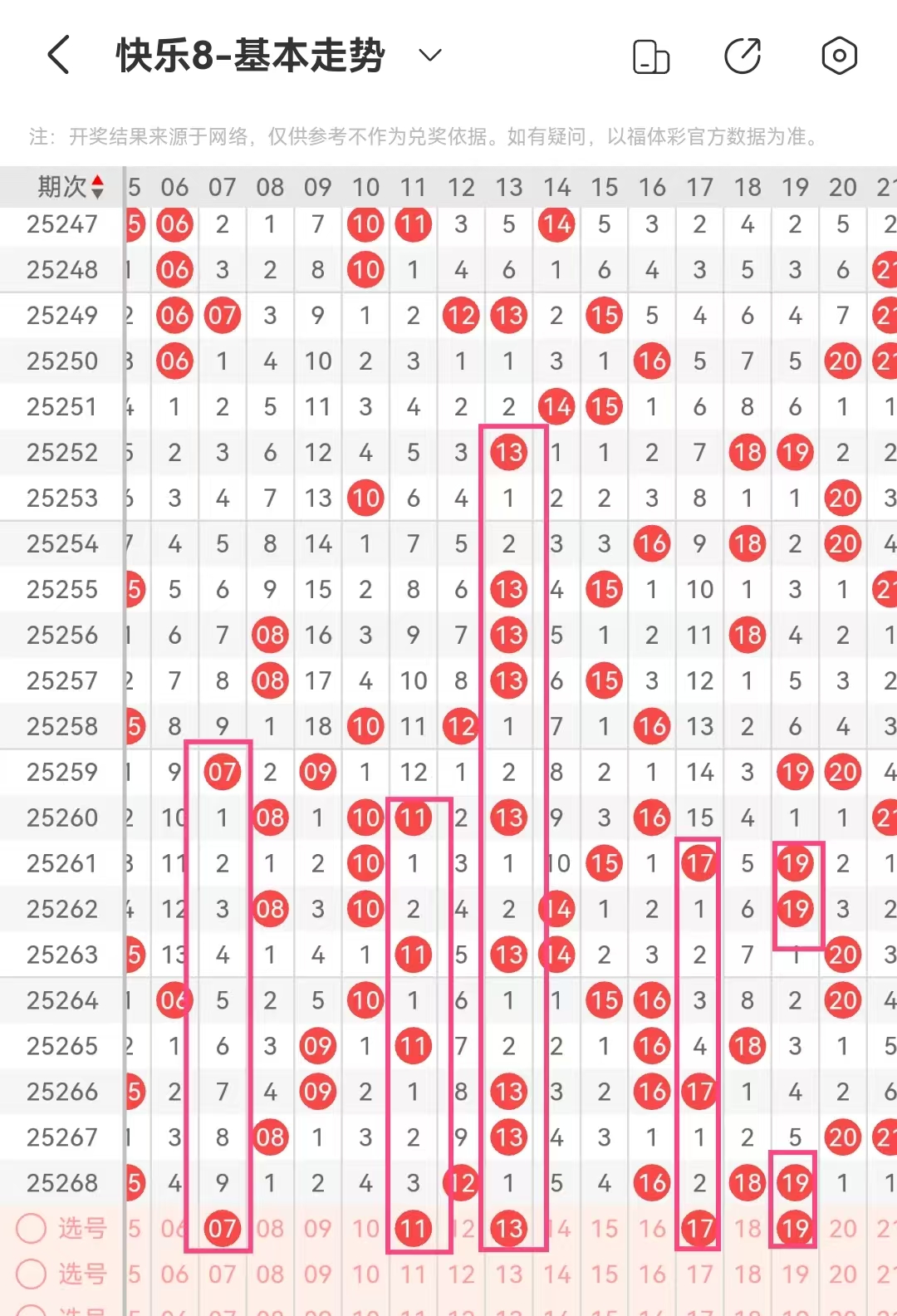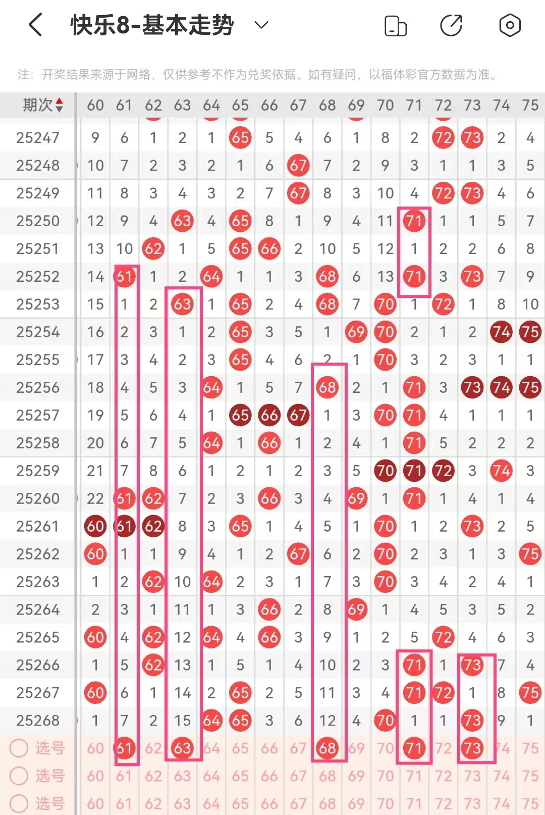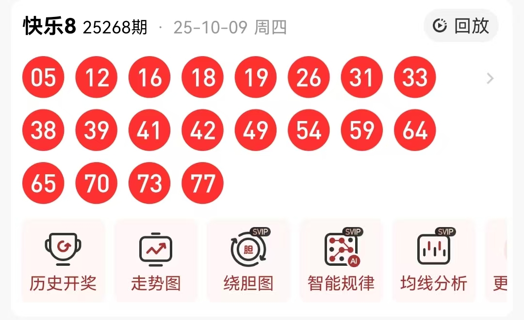 福彩快乐 8 第 2025268期的开奖号码为05 12 16 18 19 26 31 33 38 39 41 42 49 54 59 64 65 70 73 77。从奇偶性来看,奇数号码有11个,偶数号码有9个,奇数占比较大;大小号方面,小号(1 - 40)开出 10个,大号(41 - 80)开出 10个 ,大小数占比均衡;和值为831。这些数据为我们接下来的分析提供了基础。