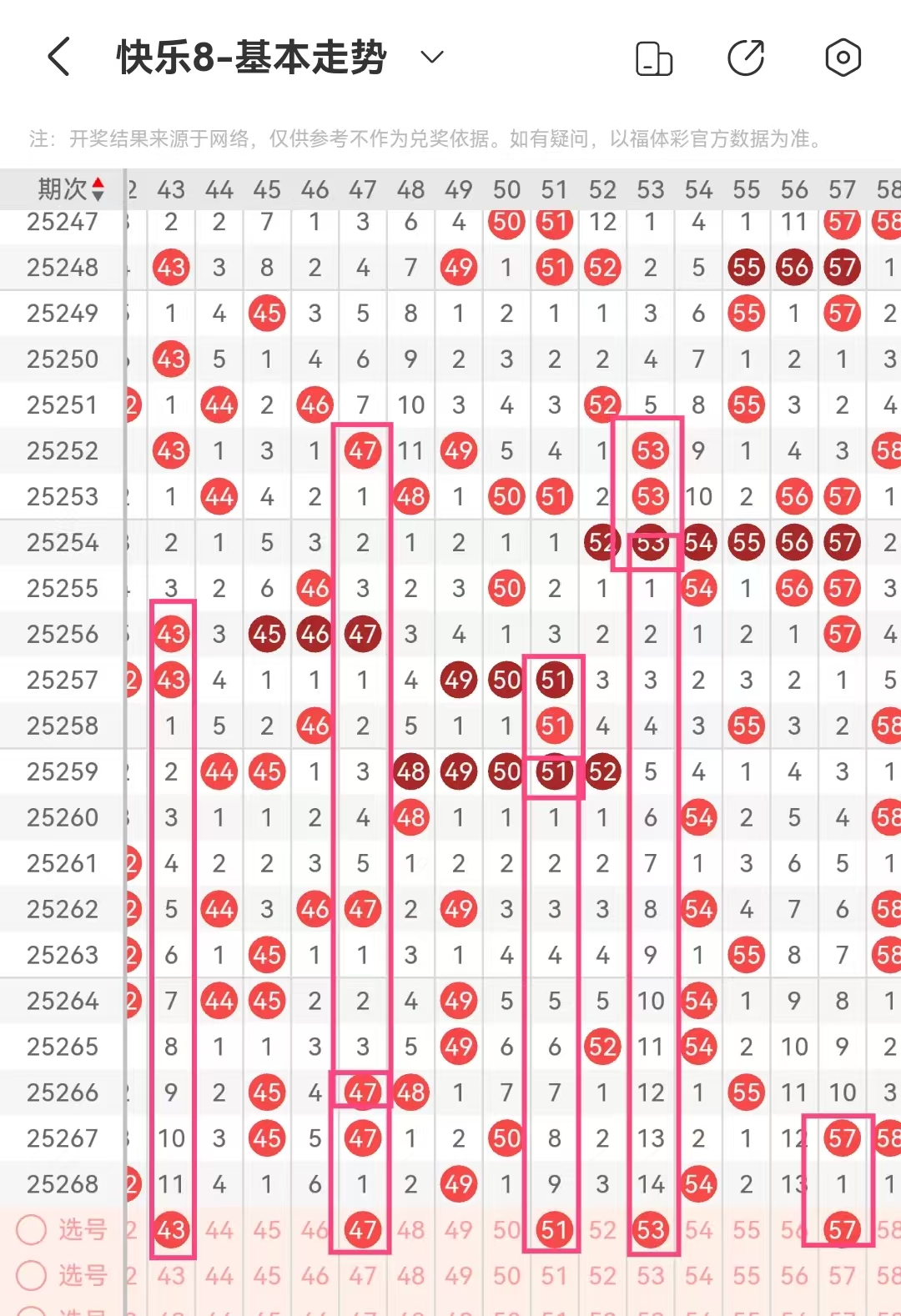 上期该区间开出 5个号码,较为活跃。考虑号码分布均衡性,本期出号数大概率会稳定在4-5个左右。该区无质数,43 遗漏 11期,高频质数,填补 41-49 段空白,尾 3 补位需求明确。47 遗漏 1期,与 49 形成邻号,历史邻号出号概率较高,质数属性强化区间质数密度,适配中段补位需求。51 遗漏 9 期,尾 1 全断背景下的关键标的,填补 50-54 段空白,奇数属性修正偶数占比。53 遗漏 14 期,远超 6 期均值,3 尾补位核心,填补 52-59 段空白,质数属性补充缺口。57 遗漏 1 期,尾 7 补位关键,衔接 54、59 形成分散连号,平衡区间末端出号。