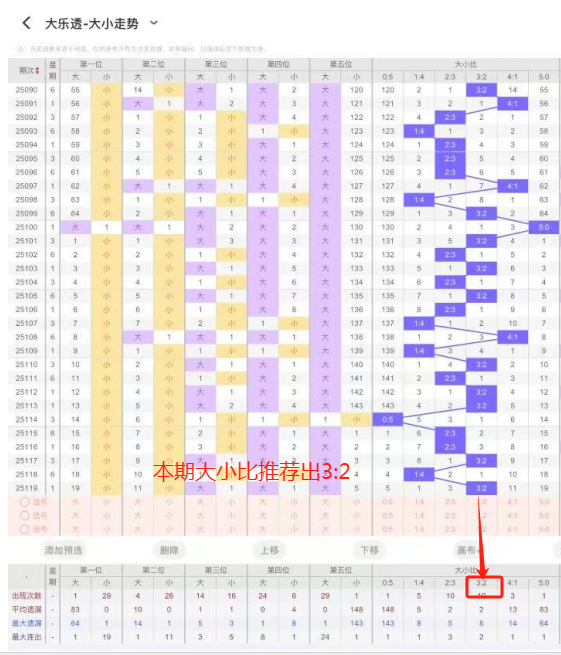 6、大小比:上期开出大小比为3:2,近77期开出4:1出现19次,3:2出现30次,2:3出现42次,1:4出现25次,5:0出现3次,本期推荐出3:2,本期重点推荐出3:2 。