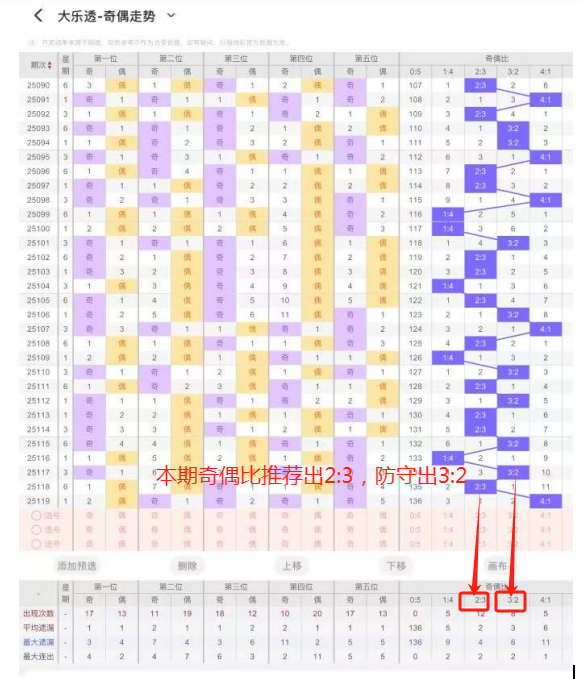4、奇偶比:上期开出4个奇数15 27 29 31,出偶数1个08,一般开出奇数期数较长,奇偶比为4:1,整体看偶数走势上升,本期重点看偶数强势,本期推荐出3:2,防守出2:3,本期重点关注2:3。