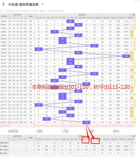 前区奖号开出1个重号,连号开出0个,奇偶比为4:1,和值为110,跨度为23,三个区间的区间比为1:1:3,后区开出0个重号,出1个大号。