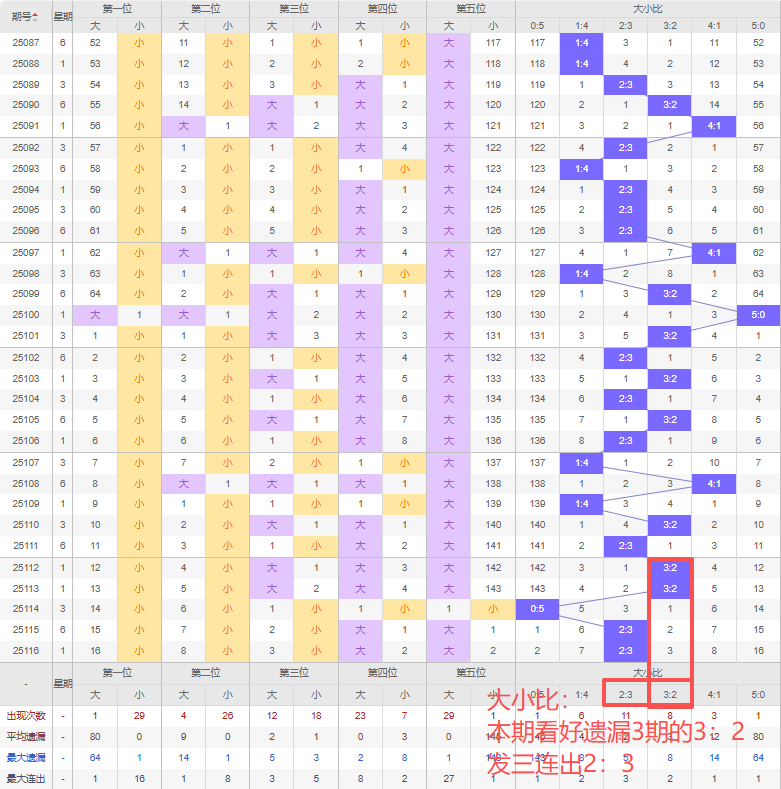 上期大小比:2:3,近10期大小比出现情况:1:4、4:1、1:4、3:2、2:3、3:2、3:2、0:5、2:3、2:3,最近10期出现3期3:2,出现3期2:3,出现1期4:1,出现2期1:4,出现0期5:0,出现1期0:5,根据近10期规律本期看好遗漏3期的3:2,防三连出2:3,综上所述推荐大小比推荐:2:3,重点关注:3:2。