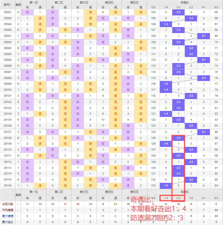 上期奇偶比:1:4,近10期奇偶比出现情况:4:1、2:3、1:4、3:2、2:3、3:2、2:3、2:3、3:2、1:4,最近10期出现3期3:2,出现4期2:3,出现1期4:1,出现2期1:4,出现0期5:0,出现0期0:5,根据近10期规律本期看好连出1:4,防遗漏2期的2:3,综上所述推荐奇偶比推荐:2:3,重点关注:1:4。