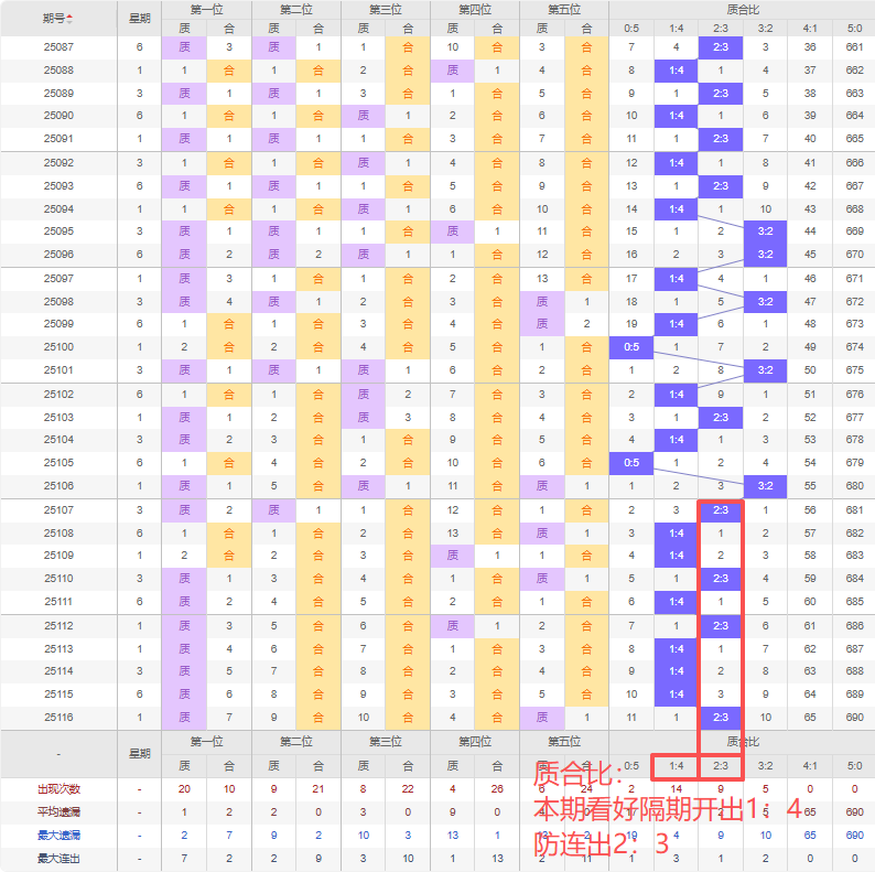 上期质合比:2:3,近10期质合比出现情况:2:3、1:4、1:4、2:3、1:4、2:3、1:4、1:4、1:4、2:3,最近10期出现0期3:2,出现4期2:3,出现0期4:1,出现6期1:4,出现0期5:0,出现0期0:5,根据近10期规律本期看好隔期的1:4,防连出2:3,综上所述推荐质合比推荐:2:3,重点关注:1:4。