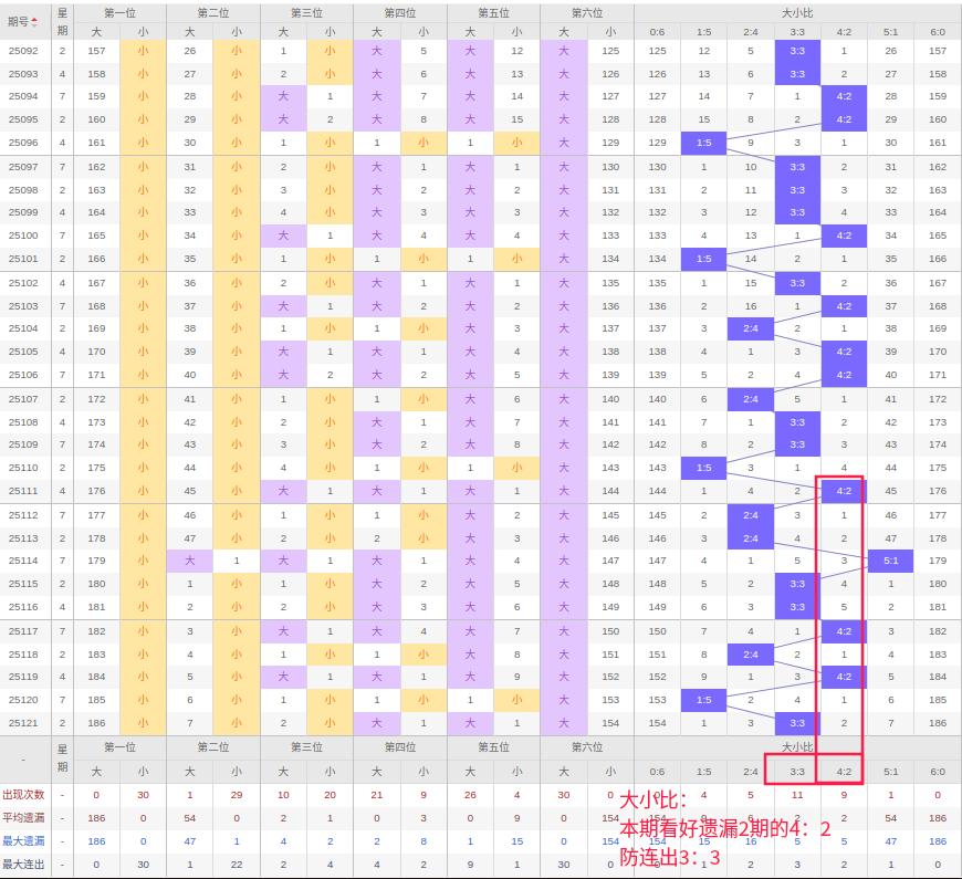 上期大小比:3:3,近10期大小比出现情况:2:4、2:4、5:1、3:3、3:3、4:2、2:4、4:2、1:5、3:3,最近10期出现3期3:3,出现2期4:2,出3期2:4,出现1期5:1,出现1期1:5,出现0期6:0,出现0期0:6,根据近10期规律本期看好遗漏2期的4:2,防连出3:3,综上所述推荐大小比推荐:3:3,重点关注:4:2。