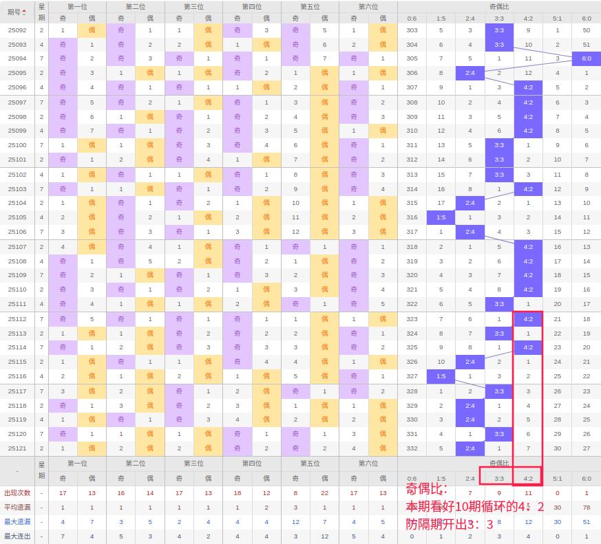 上期奇偶比:2:4,近10期奇偶比出现情况:4:2、3:3、4:2、2:4、1:5、3:3、2:4、2:4、3:3、2:4,最近10期出现3期3:3,出现2期4:2,出现4期2:4,出现0期5:1,出现1期1:5,出现0期6:0,出现0期0:6,根据近10期规律本期看好10期循环的4:2,防隔期开出期3:3,综上所述推荐奇偶比推荐:3:3重点关注:4:2。
