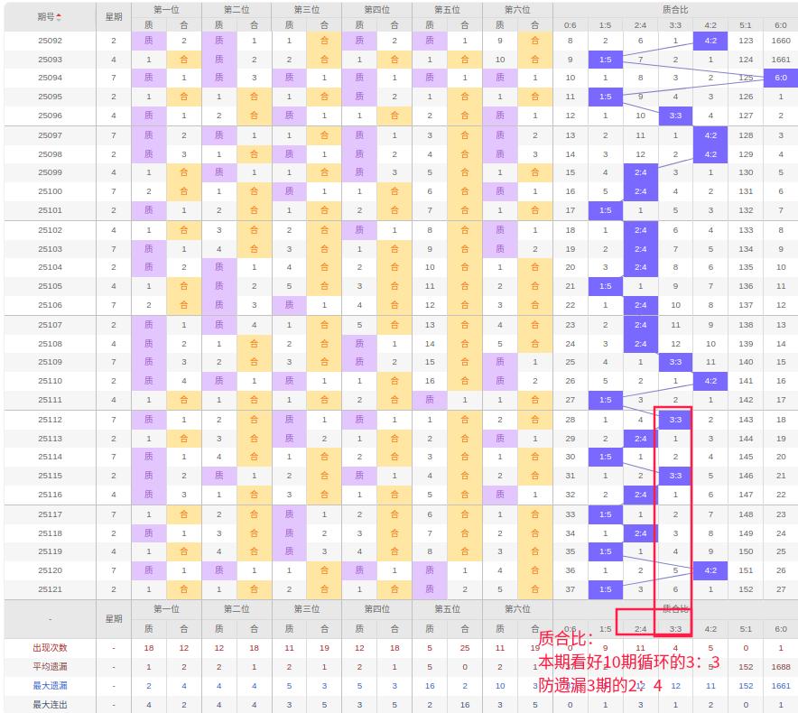 上期质合比:1:5,近10期质合比出现情况:3:3、2:4、1:5、3:3、2:4、1:5、2:4、1:5、4:2、1:5,最近10期出2期3:3,出现1期4:2,出现3期2:4,出现0期5:1,出现4期1:5,出现0期6:0,出现0期0:6,根据近10期规律本期看好10期循环的3:3,防遗漏3期的2:4,综上所述推荐质合比推荐:2:4,重点关注:3:3。
