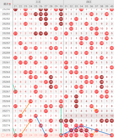 四区开出:32,33,34,35,37 奇偶比: 3:2 和值:171 跨度:5,上期开出5个号码,奇数号码占优势。本期三斜连走势:31 32 33 35 36,隔码斜连走势:40,近10期平均出号2.6枚。本期推荐关注号码:33、35、36、40。