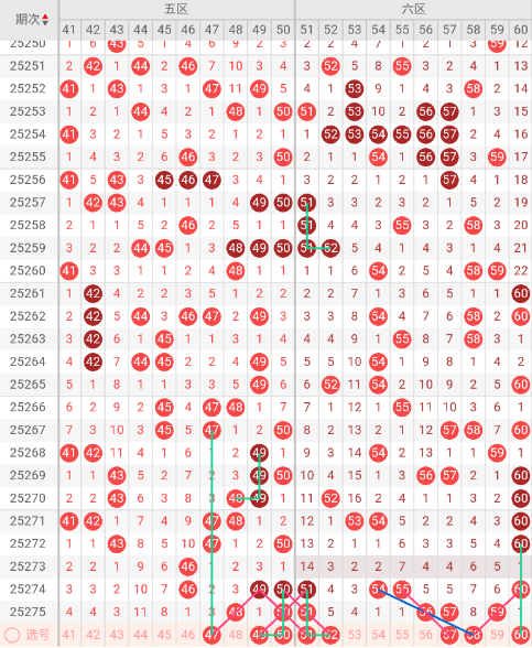 六区开出:51,56,57,59 奇偶比: 3:1 和值:223 跨度:8,上期开出4个号码,奇数号码占优势。本期三斜连走势:51 52 57 58,隔码斜连走势:58。近10期平均出号2.4枚,本期推荐关注号码:51、52、58、60。