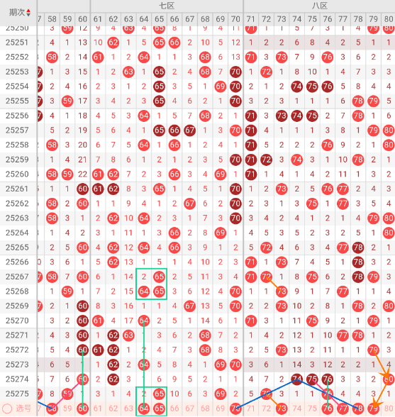 七区开出:65,69 奇偶比: 2:0 和值:134 跨度:4,上期开出2个号码,奇数号码占优势。本期无三斜连走势,隔码斜连走势:70。近10期平均出号2.2枚,本期推荐关注号码:64、65、70。