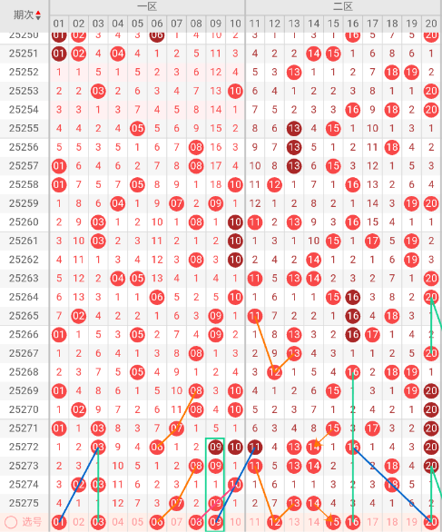 二区开出:13,14 奇偶比: 1:1 和值:27 跨度:1,上期开出2个号码,奇偶数号码均衡。本期无三斜连走势,隔码斜连走势:20,近10期平均出号3.1枚。推荐关注号码:12、15、16、20。