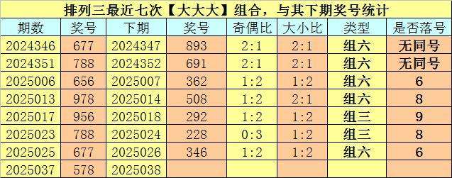 大小分析:排列三上期开出号码578,大小类型为【大大大】,最近七次开出大小类型大大大的奖号分别为:677、788、656、978、956、788、677,其下期分别开出号码:893、691、362、508、292、228、346。其中号码大小比为10:11,大小 号码开出比例基本相等,本期预计小 号转热,关注大小比1:2。