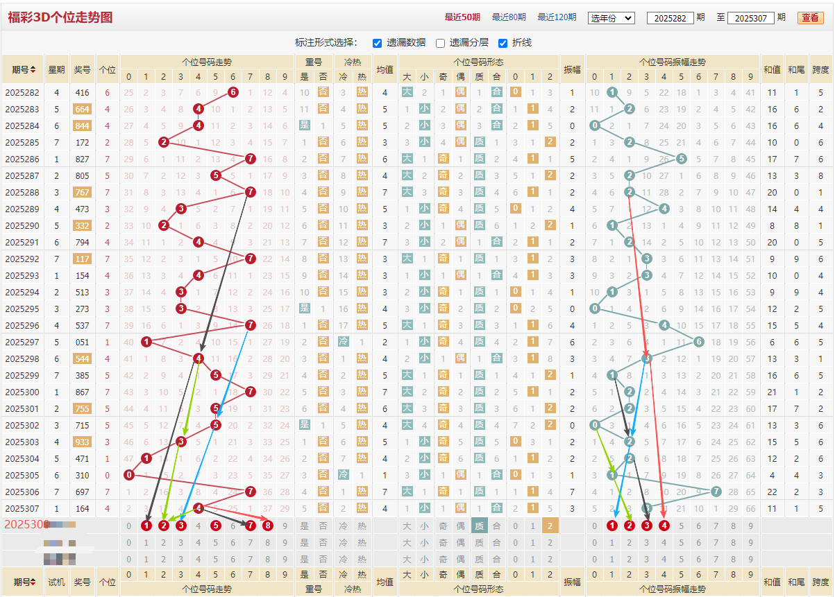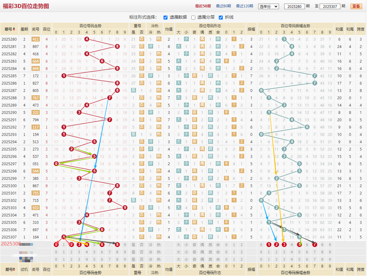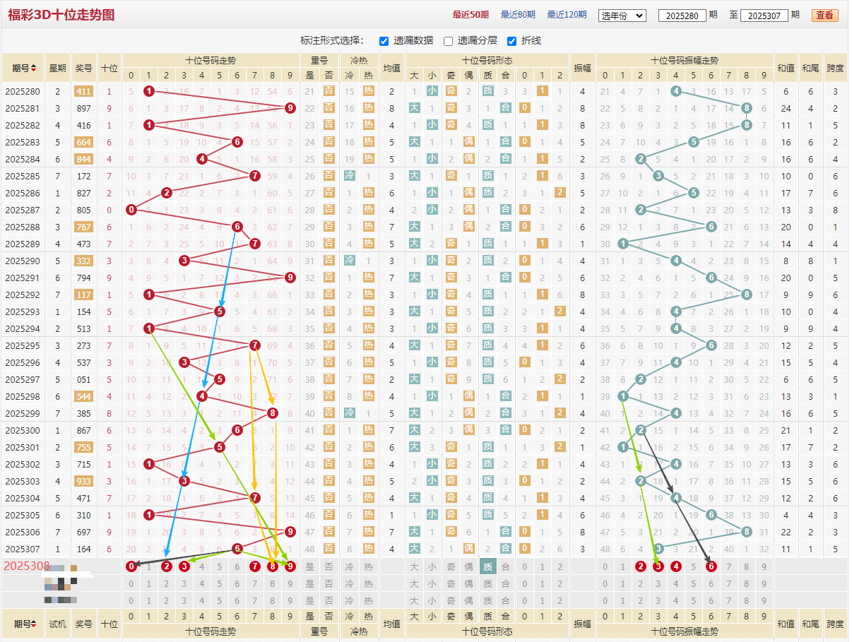 百位近期走势:5/2/5/0/5/3/8/7/7/9/4/3/6/1,质数占优开出9期,本期个人则重点看合数,质数太热小防一手,见上图振幅黄色线1/2/3振幅下来对应数字4,看左边蓝色线7/5/3下来,重点绿色线2505和3616同样走势,综合上述百位推荐:023468