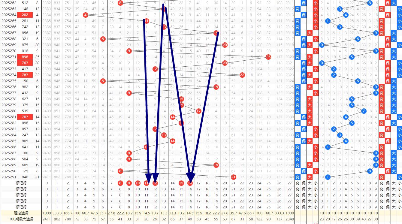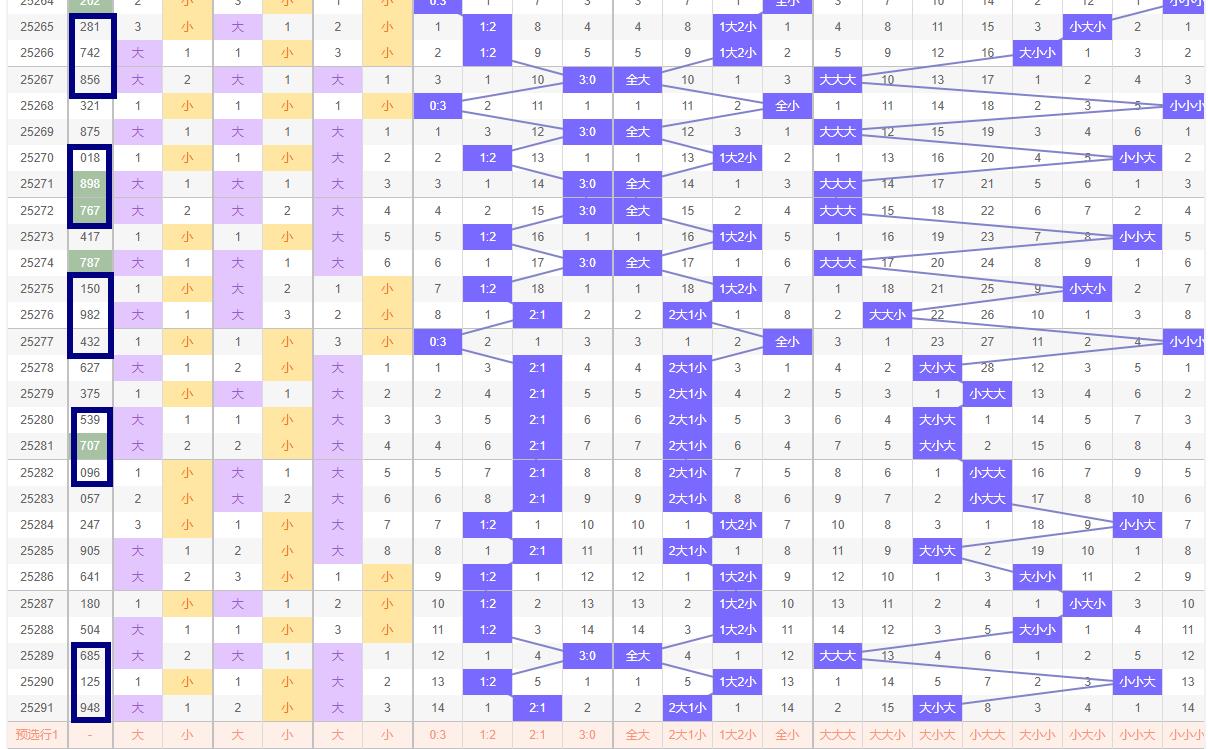 大小走向分析: 在排列3中,大小走势是判断号码分布的重要依据。根据291期开奖结果948,大小比为2:1;形态奇偶偶形态。结合历史走势图,发现近期大小比例呈现出一定的波动性,但整体趋势相对均衡。因此,292期关注的大小比例1:2,即可能继续出现一个大奖号和两个小奖号,或者转变为三个小奖号。应充分考虑这一趋势,合理分配投注比例。防(组三)