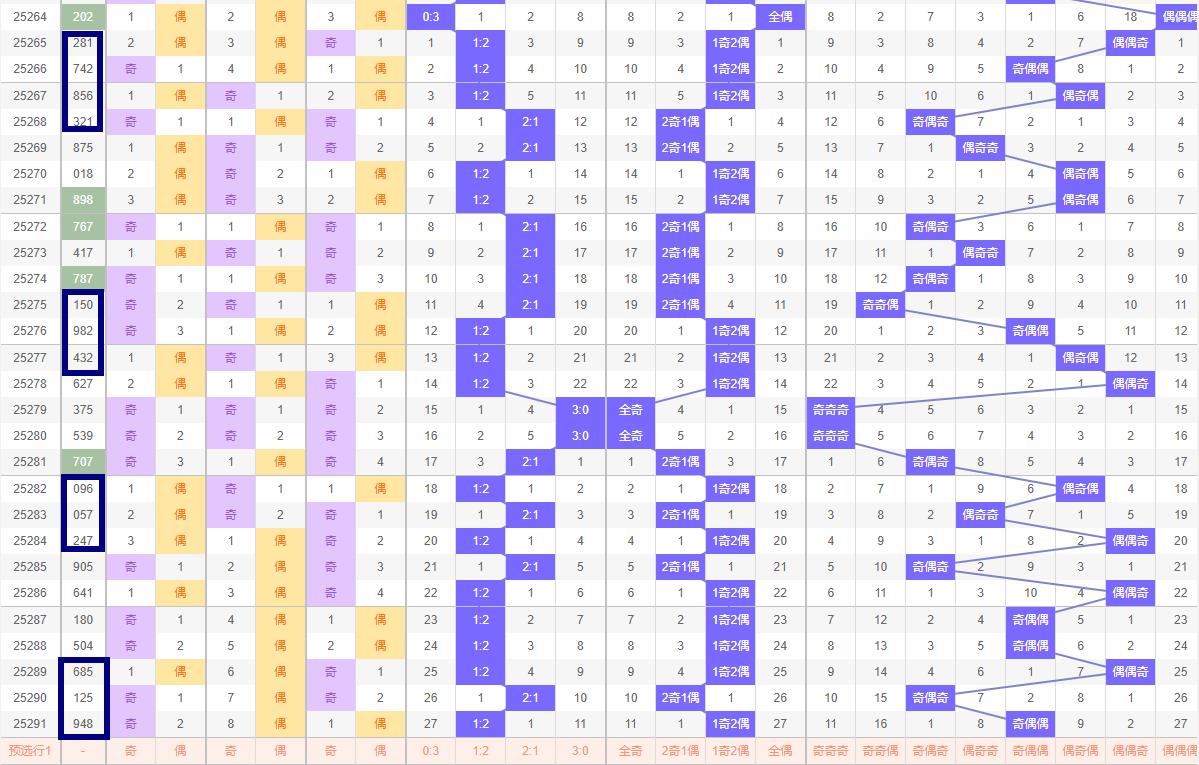 奇偶比例分析 奇偶比例同样是排列3分析中的重要一环。291期开奖号码为948奇偶比为1:2,即1个奇数和2个偶数。从近期走势图来看,奇偶比例分布较为均衡,没有出现明显的偏态。因此,本期可以继续关注1:2或者2:1的奇偶比例。可以根据这一比例进行号码筛选。