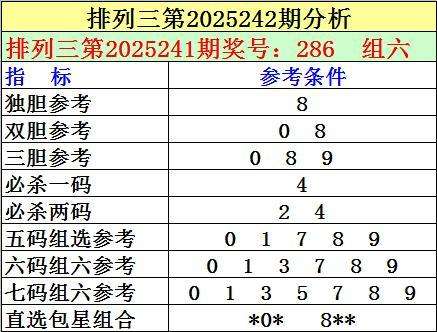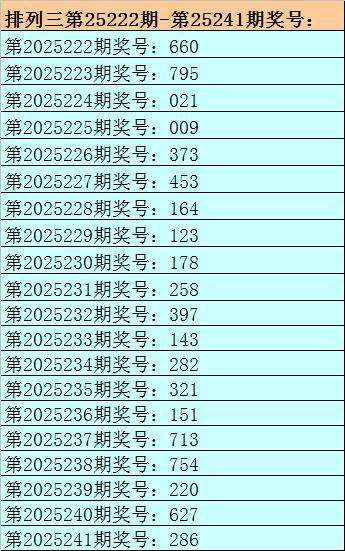 开奖回顾:排列三第2025241期开出奖号:286。其中奖号大小比为2:1,奇偶比为0:3,012路比为1:0:2,和值为16,跨度为6。