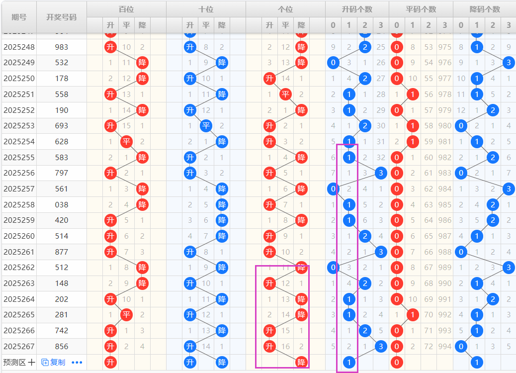 【排列3个位】:近十期升降走势为:升-降-升-降-升-升-降-升-降-降-升-升,为一种单一加重复性的交错走势,结合走势图可以看出,图中紫色框圈出为一种M形态的出球方式,本期可以重点看好升的形态号码的开出。