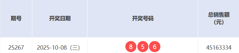 第2025267期排列三开奖号码为 8-5-6,和值 19,奇偶比为 1:2,大小比为 3:0,跨度 3,012路形态为 2路、2路、0路。全国直选中出15,616注,组选六中出80,266注。本期我们将结合走势,为大家带来第268期的分析推荐。