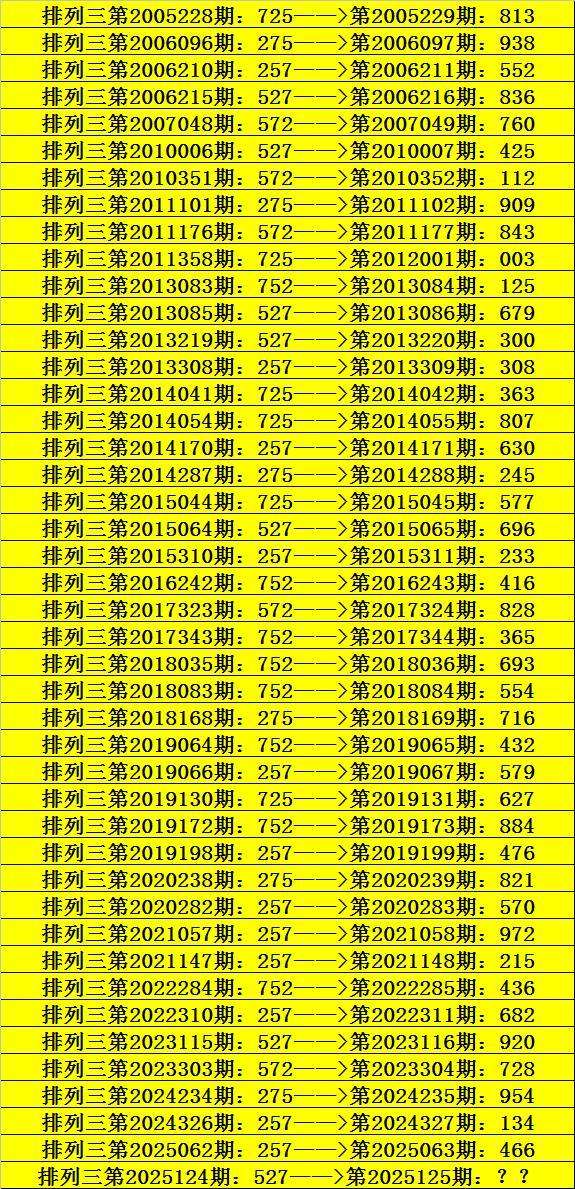 第2025124期排列三奖号为527,历史上该号码组选开出44次,下期奖号分别为:813、938、552、836、760、425、112、909、843、003、125、679、300、308、363、807、630、245、577、696、233、416、828、365、693、554、716、432、579、627、884、476、821、570、972、215、436、682、920、728、954、134、466。