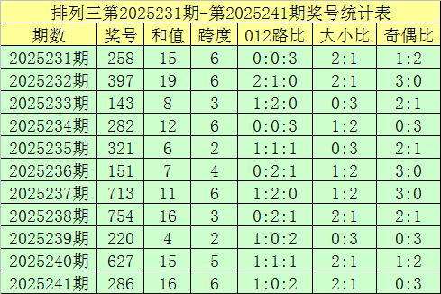 开奖回顾:排列三第2025241期奖号开出:286,组选类型:组六,大小比为2:1,奇偶比为0:3,和值为16,跨度为6。