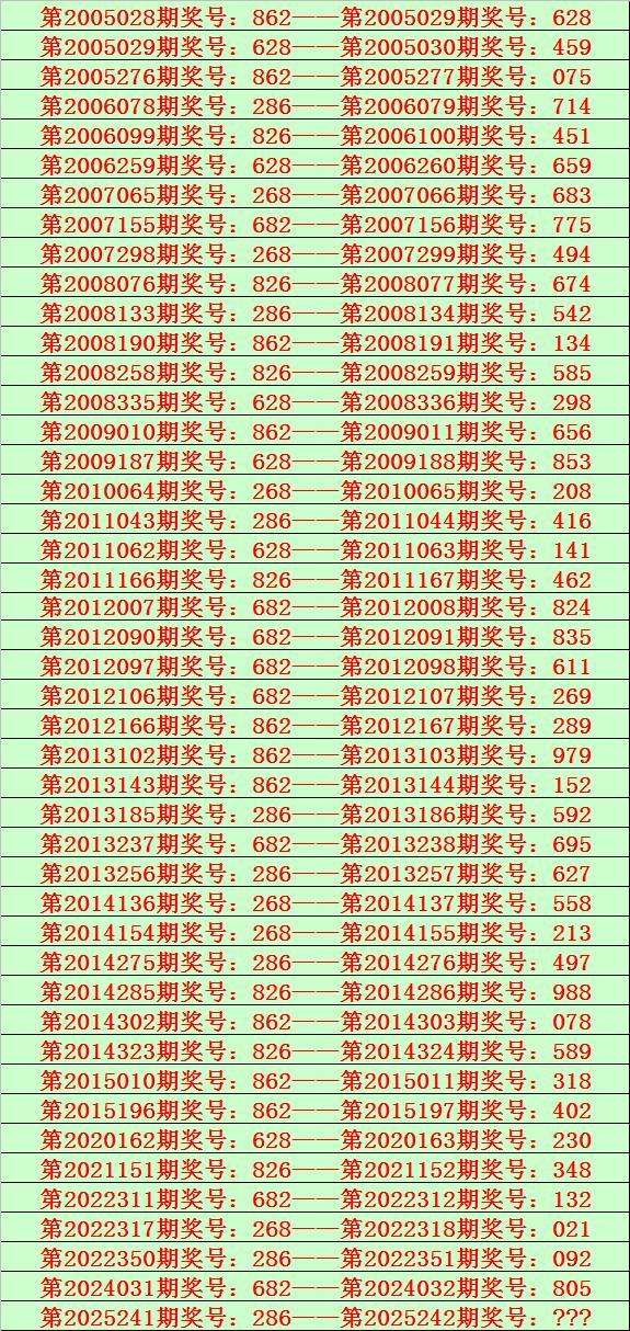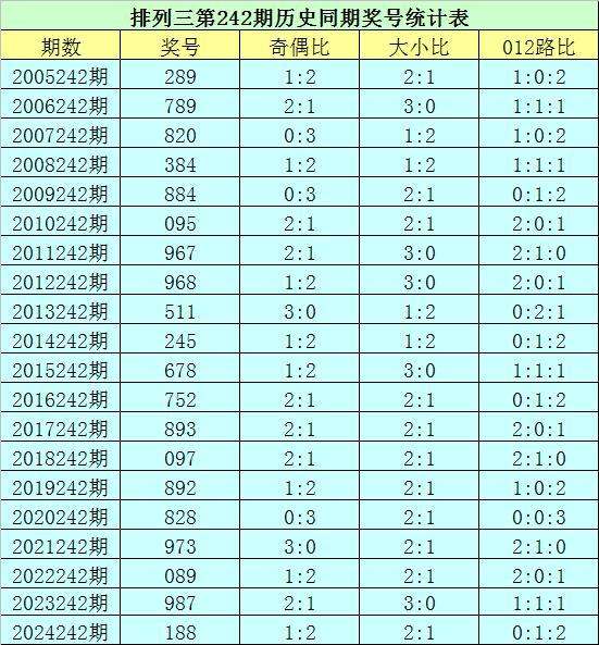 排列三第2025242期开奖日期:2025年9月9日,历史上第242期已开出了20次奖号,历年同期号码分别为:289、789、820、384、884、095、967、968、511、245、678、752、893、097、892、828、973、089、987、188。