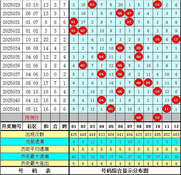 前区温码判断:在大乐透第2025041期开奖之后,前区目前有12个遗漏值4-9之间的温码,温码遗漏分布为:号码05 23遗漏值为4期、号码13 30遗漏值为5期、号码25 28 29遗漏值为6期、号码33遗漏值为7期、号码01 10遗漏值为8期、号码12遗漏值为9期。