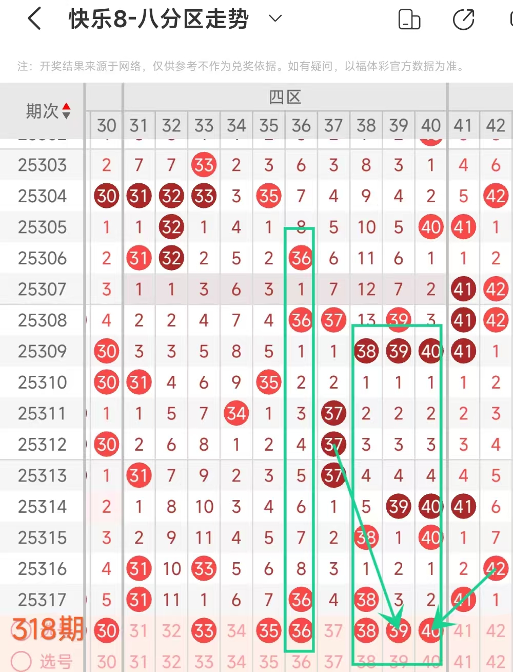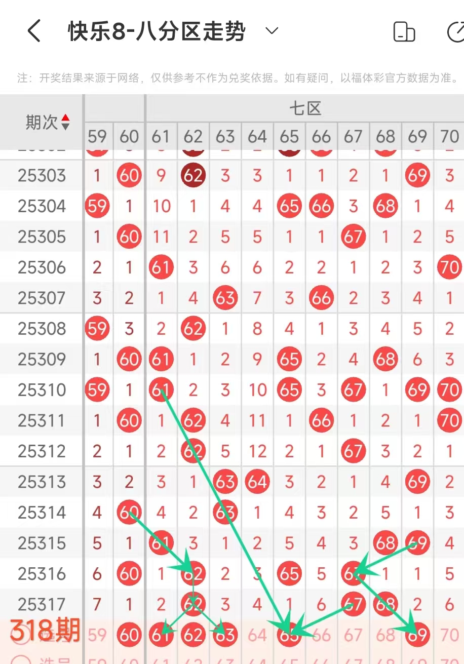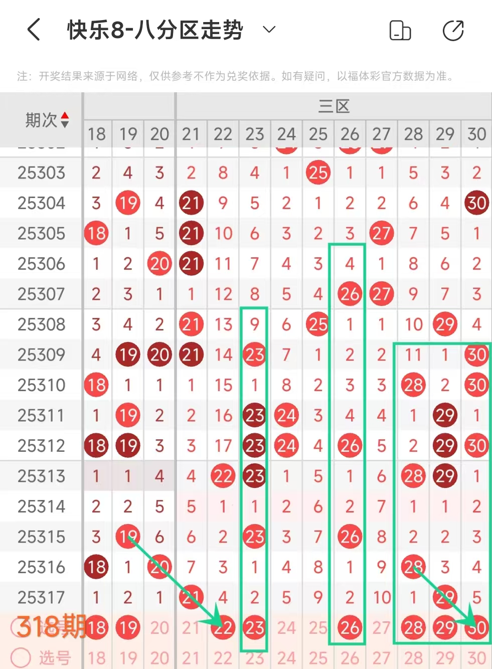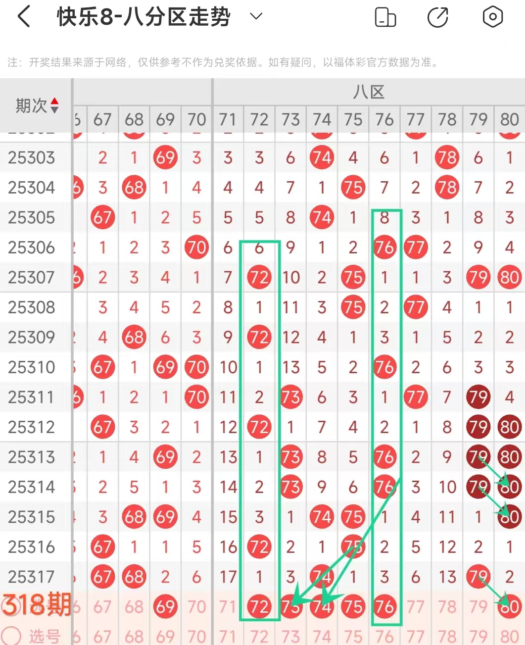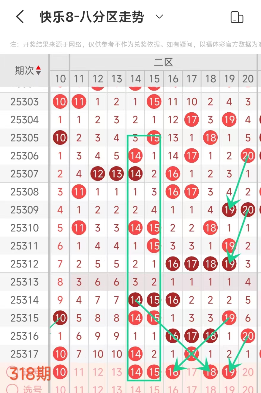 在快乐8的探索之旅中,通过对开奖走势图细致入微的观察,我们总结出一些具有参考价值的规律。几乎每一期开奖号码都呈现出以下显著特征:其一,大概率出现连号;其二,常常伴有边码;其三,遗漏值为1 2 3的号码频繁现身;其四,重号现象也较为常见。掌握这些要点,能为我们的投注提供方向指引。我们约定采用八分区走势图来展开分析。