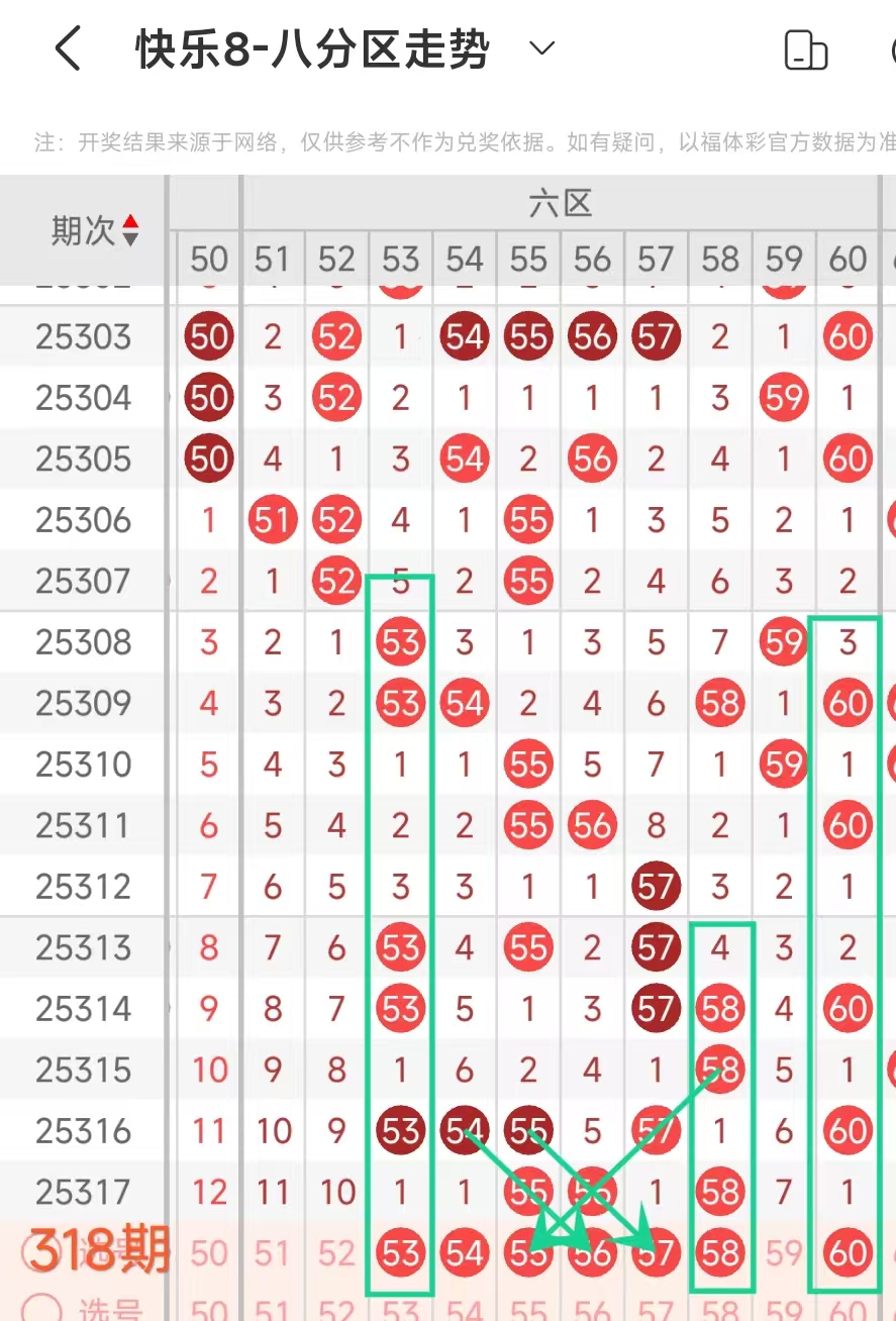 上期六区开出55 56 58这3个号码,本期应该出2个。