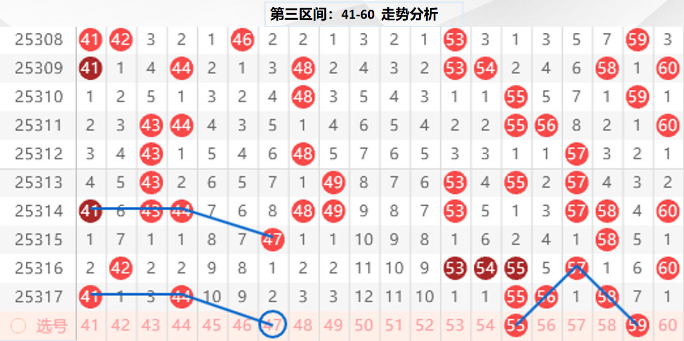 三区分析:【41-60】(走势图标注号码非小黄车大底,请谨慎参考,具体思路将在直播间分享讨论)