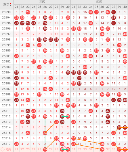 三区开出:21,29 奇偶比: 2:0 和值:50 跨度:8,上期开出2个号码,奇数号码占优势。本期三斜连走势:30,无隔码斜连走势,近10期平均出号2.5枚。推荐关注号码:26、29。