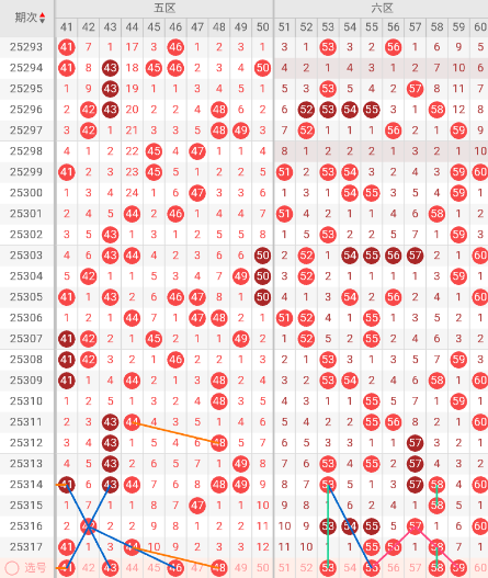 五区开出:41,44 奇偶比: 1:1 和值:85 跨度:3,上期开出2个号码,奇偶数号码均衡。本期三斜连走势:41,隔码斜连走势:41 43 46。近10期平均出2.2枚,本期推荐关注号码:41、43、48。