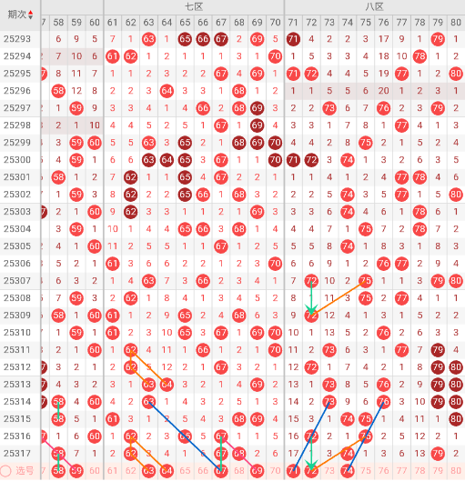 八区开出:74,79 奇偶比: 1:1 和值:153 跨度:5,上期开出2个号码,奇偶数号码均衡。本期无三斜连走势,隔码斜连走势:71 74。近10期平均出号2.4枚,本期推荐关注号码:71、72、74。